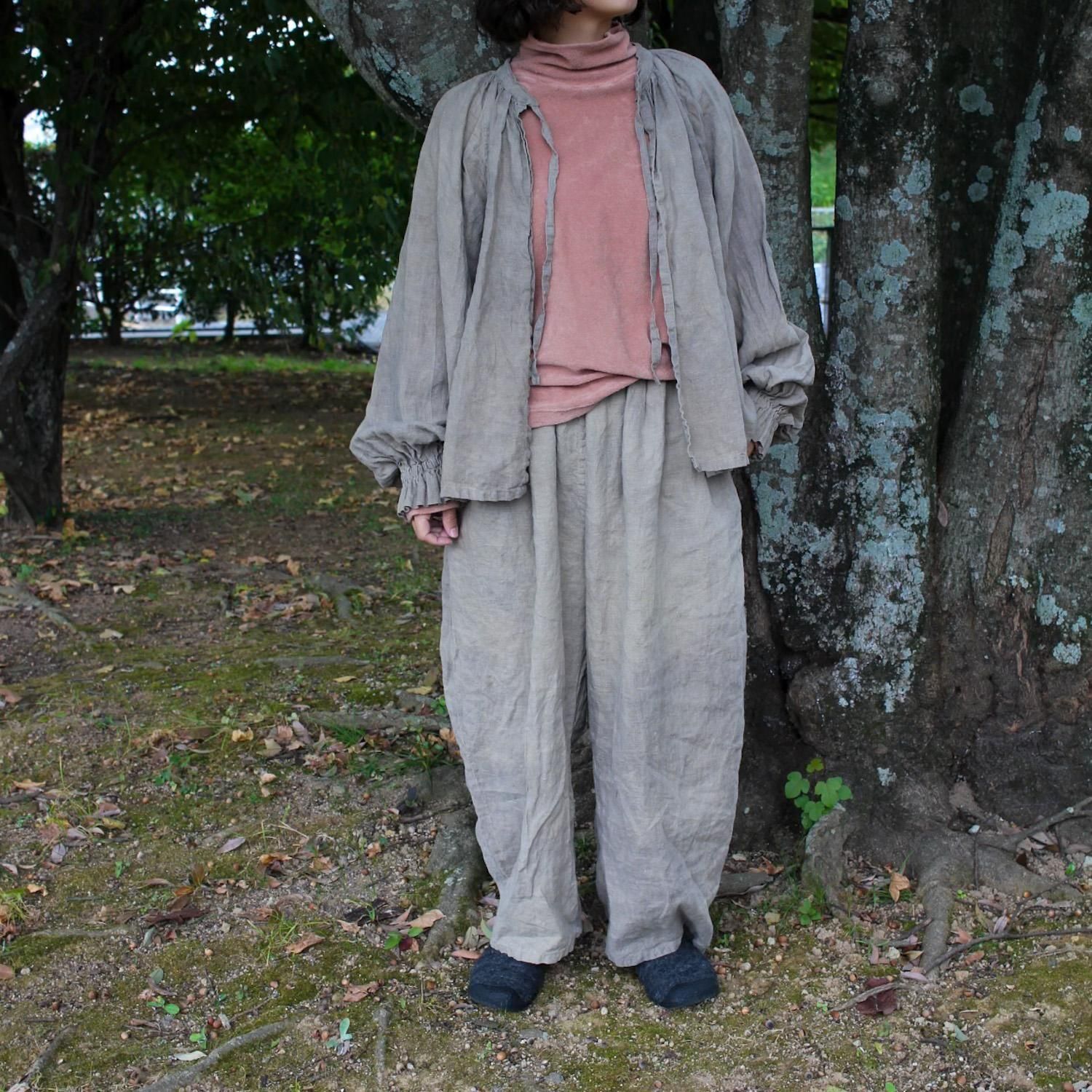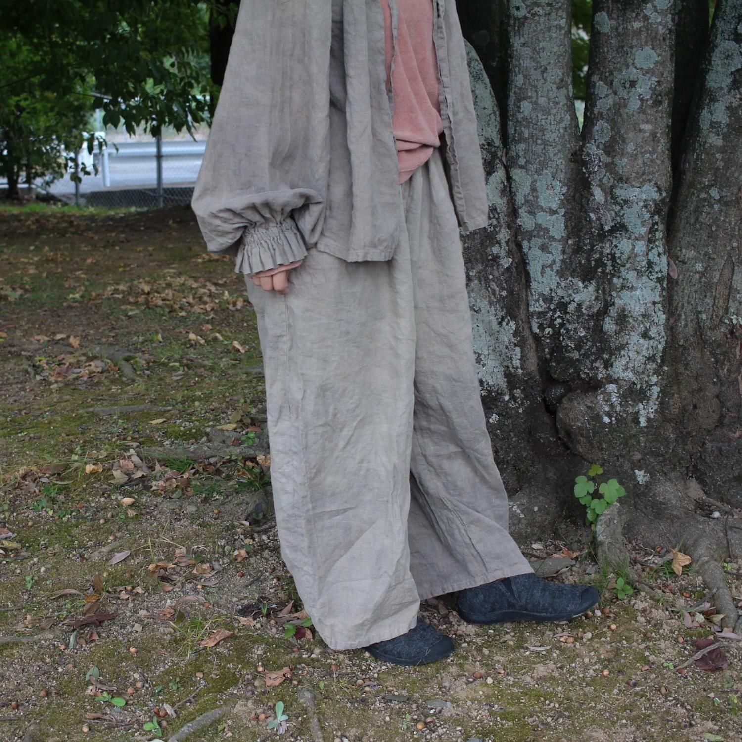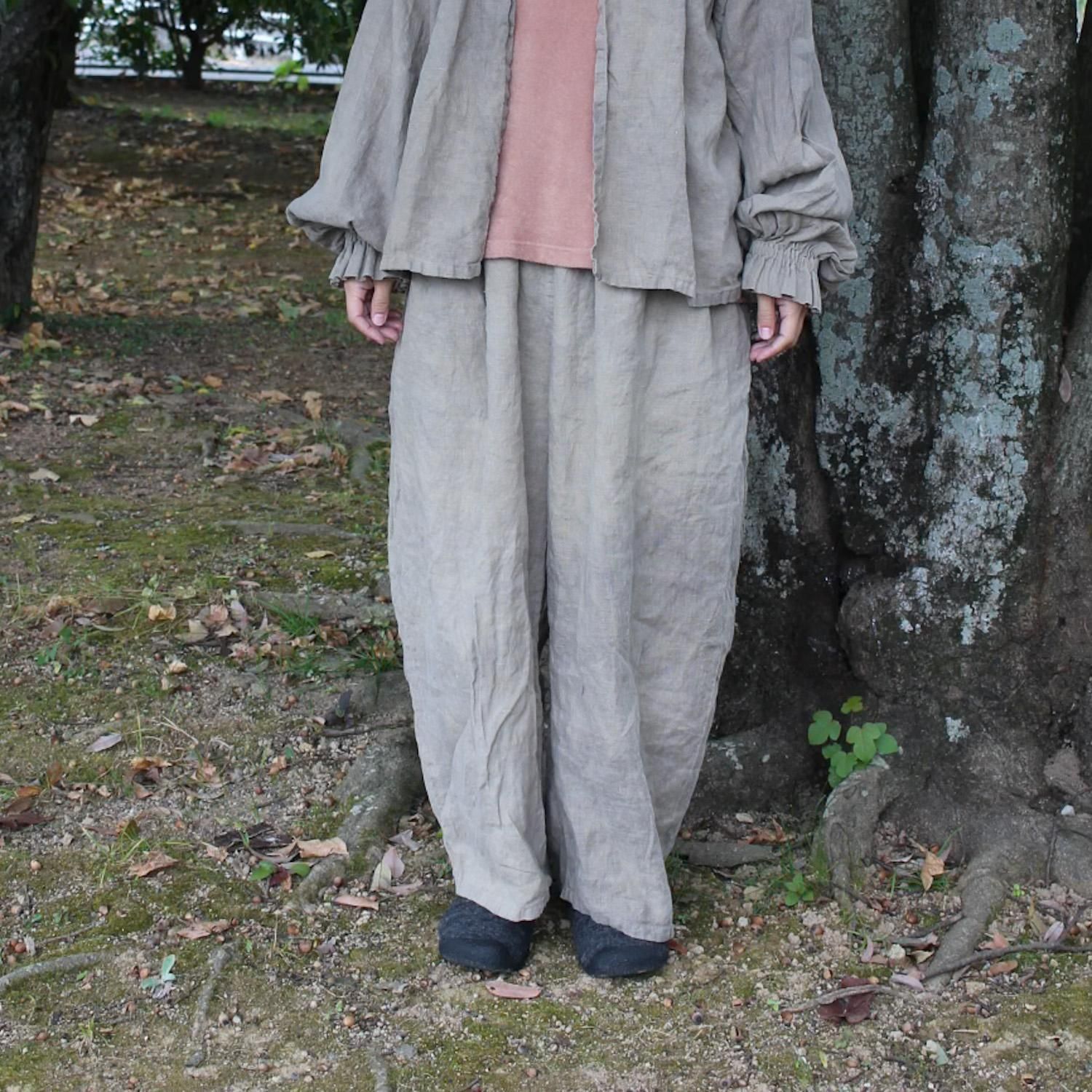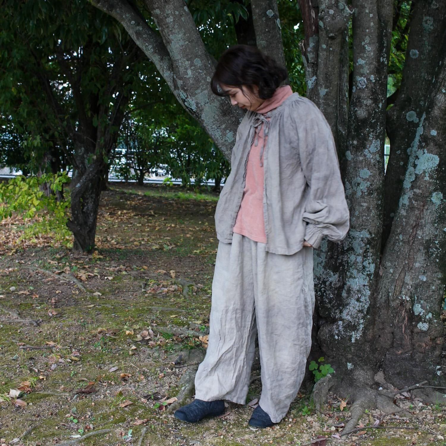 老竹色のやさしいグレーベージュが自然と肌になじみ、同色のリネンジャケットとセットで着ると、より落ち着いた雰囲気になります。