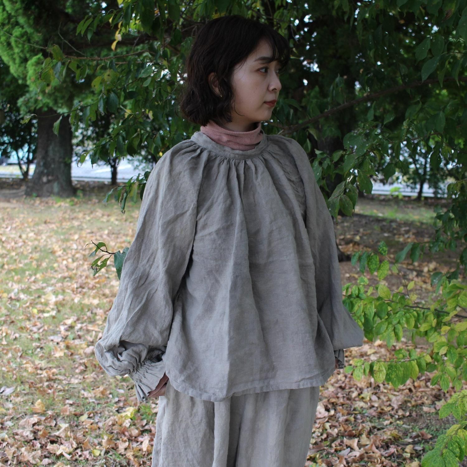 同色のリネンパンツとのセットアップや、淡色・生成とのレイヤードもおすすめ。季節を問わず楽しめる、静かな存在感のあるブラウスです。