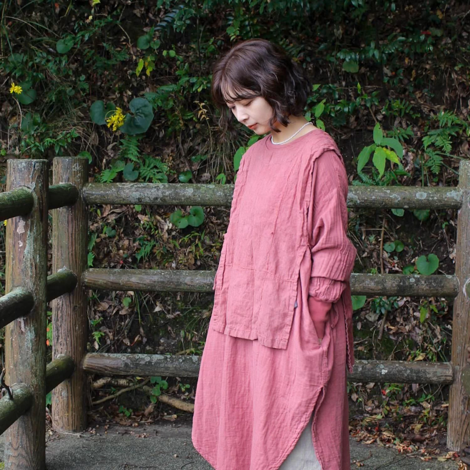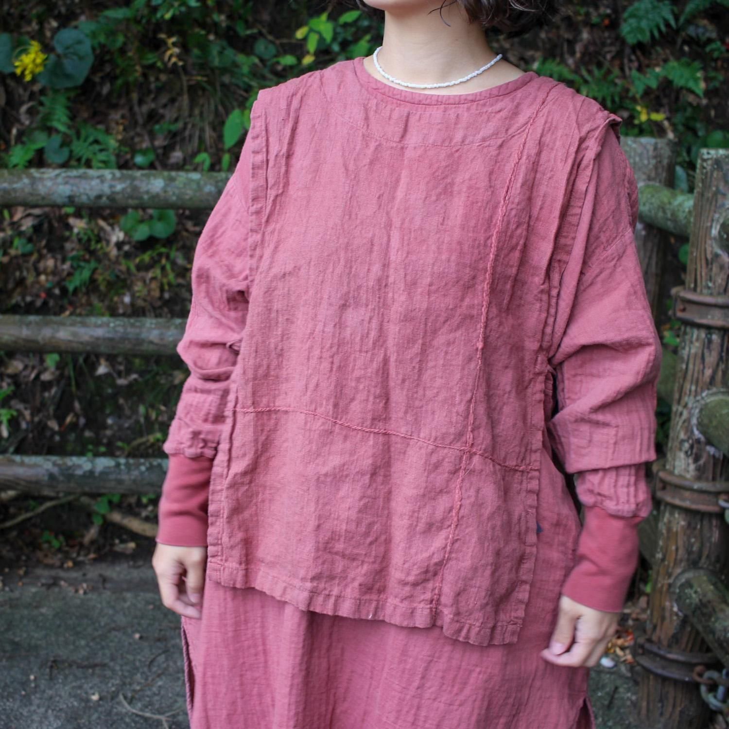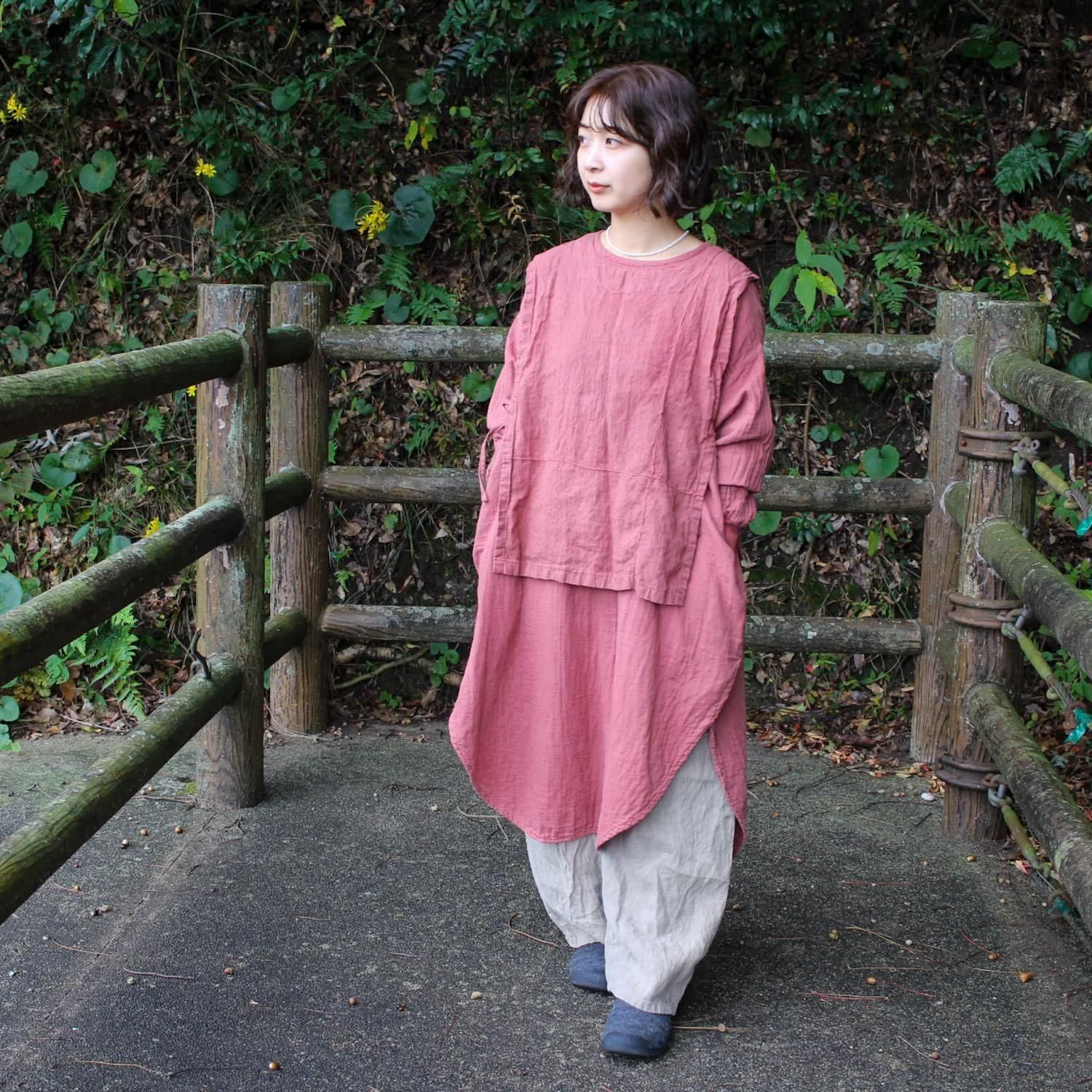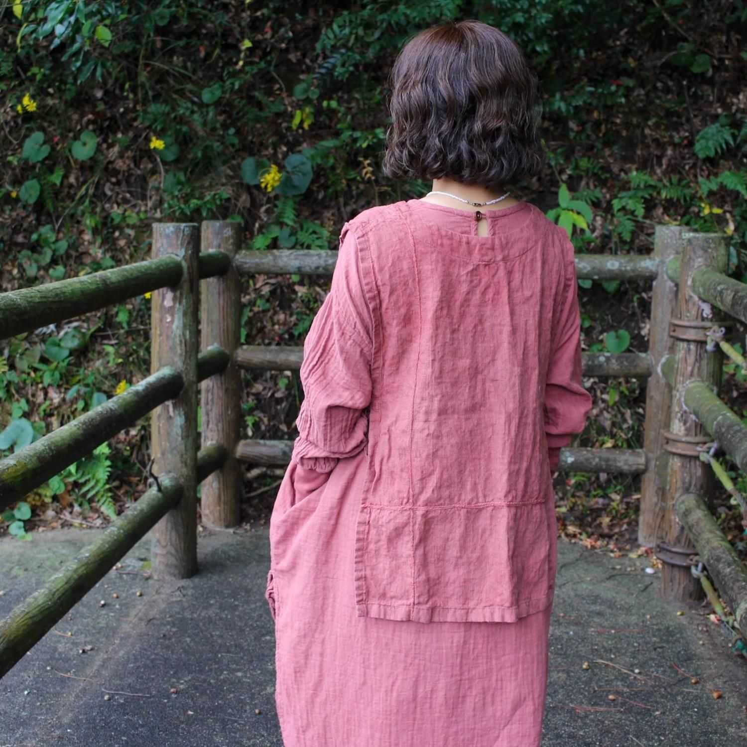 素材はリネン100%。軽やかな着心地で、季節を問わず快適にお使いいただけます。色はインド茜染めによる「小豆色(あずきいろ)」。柔らかな赤みの中に深みがあり、自然素材ならではの優しい表情が楽しめる色合いです。