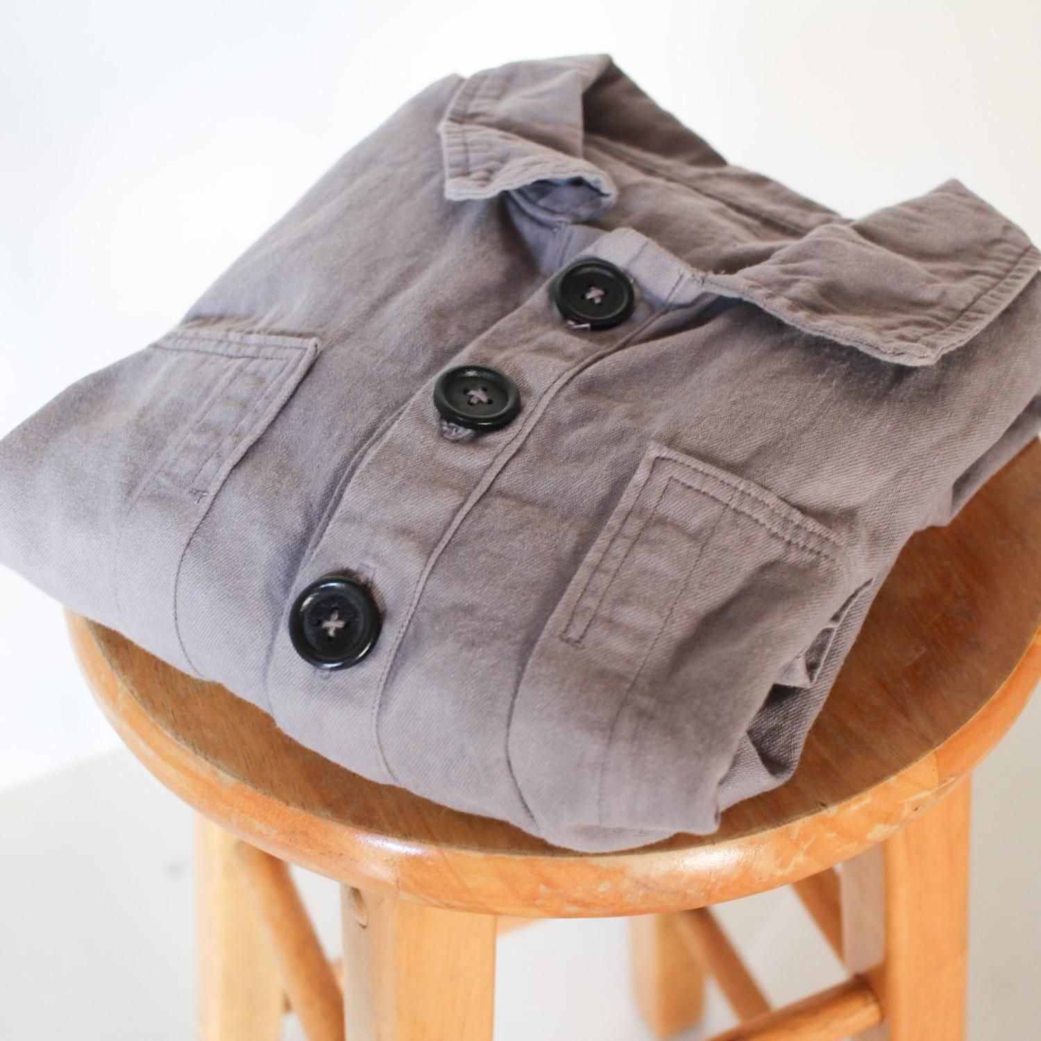 生地には綿100%の8オンスデニムを使用。しっかりとした安心感がありながらも軽やかで、洗うたびに空気を含み、身体に自然と馴染んでいきます。胸元は深めの前立て仕様で、一枚でもレイヤードでもバランスよく着用可能。大きめのボタンがさりげないアクセントとなり、両サイドのポケットが実用性と安定感を添えています。